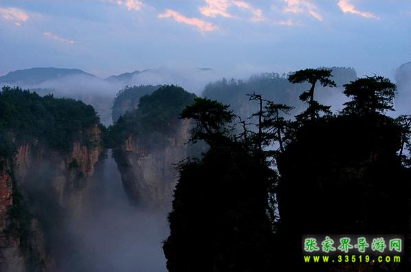 在“后花園”的對面,是一座巍峨的山巒,山上古木參天,遮天蔽日。森林中常有野山羊出沒,夜深人靜之際,常能聽到野羊羔“咩洋”地叫聲,因此被稱作“羊寨”。民國時期,此地曾為土匪占領(lǐng),直到現(xiàn)地,山上還殘留有卡門、暗堡、斷壕、屋場、水井、碓臼、磨坊等殘跡。粗大的松樹上還留有土匪當年留下的“V”字型標志。站在“山寨”上,舉目眺望,可看見金鞭溪全景,只見一條美麗的溪水從數(shù)百座石林中緩緩穿過,顯得是那樣的幽靜、和諧。從“后花園”向前步行約100米,便是袁家界又一處絕世奇觀——迷魂臺,走上迷魂臺,只見上百座山巒拔地而起,峰涌而至,它們姿態(tài)萬千、氣勢非凡;有的似“天狗望月”,有的像“海螺出水”;有的像“將軍列隊”,有的如“一柱擎天”。幾道山坳和屏障將這些山巒有序的分開,使這些石峰更顯得層次分明,井然有序,在萬道霞光的點綴下,顯得蔚為壯觀,不同凡響。這更像是一幅畫家筆下的水墨丹青,“迷魂臺”攬勝,真宛如仙境神游啊。