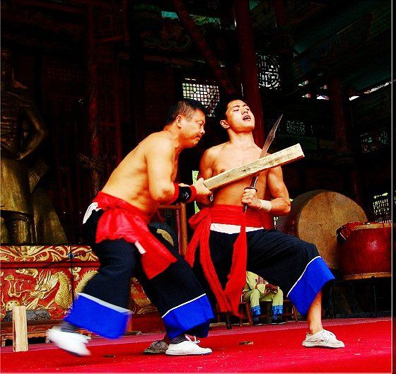 大庸氣功 大庸氣,堪稱武林奇葩,曾為祖國贏得聲譽(yù),海內(nèi)外享有極主名望。 大庸氣功是大庸各民族特別是土家族傳統(tǒng)體育項(xiàng) 目之了,分健體氣派、武術(shù)氣功兩類。前者有“返還 功”、“馬王推氣功”、“少林達(dá)摩醫(yī)療保健氣功” 等;后者有靜坐、壁虎、靈子、二指彈、碎石、松靜 、硬氣、五禽、五陽功等,尤以硬氣功著稱。大庸硬 氣功,歷史悠久,漢代相單程,明代覃后,清代劉明 燈,當(dāng)代湯子模、周鐵鞭、杜心武、趙繼書等都具有 超人硬氣武功。大庸土著民族在漫長的反征服、反壓 迫斗爭,博采武當(dāng)、少林南北派、昆侖派眾家武林精 華,創(chuàng)造出獨(dú)此一家的大庸硬氣功。 據(jù)傳,大庸硬氣功鼻祖是楚國鬼谷子?!?a class="insidelink" href="http://www.lkqczs.cn/cityinfo/15580531721.html" title="永定區(qū)">永定縣 志》有關(guān)鬼谷子隱居天門山鬼谷洞潛心學(xué)《易》、傳 授方術(shù)的記載。到清代有武林高手朱茂嶺,隱居三岔 村北芭蕉灣洞,研究鬼谷氣功之術(shù),后收西溪坪胡口 子、余世萬(即“余通人”)為徙,傳其衣缽。余通 人將武術(shù)氣功系統(tǒng)整理,發(fā)揚(yáng)光大,播名于世。 新中國成立后,黨和政府十分重視民間氣功發(fā)掘 整理,并正式列為體育項(xiàng)目加以普及發(fā)展,今日大庸 市習(xí)練硬氣功達(dá)數(shù)萬人眾。永定區(qū)官黎坪村世有“硬 氣功之鄉(xiāng)”盛譽(yù),該村男女老幼,練功已蔚成風(fēng)氣, 其武師趙繼書,1979年先后參加全省和全國武術(shù)大賽 ,均獲一等獎,受到國家體委重視,同年7 月趙繼書 專程到北京給中央領(lǐng)導(dǎo)同志匯報(bào)表演。嗣后,隨同中 國武術(shù)代表團(tuán)和國家領(lǐng)導(dǎo)人先后兩次出國,到盧森堡 、意大利、比利時(shí)、羅馬尼亞、馬其他和東南亞等國 家訪問。他表演的臥刀碎石、頭頂開石、雙鳳灌耳、 頭碰石柱、叉尖推磨等精彩節(jié)目,博得外國友人好評 。盧森堡一位榮獲國家獎牌的武士,看了表演后連夜 來到中國大使館,將自己珍藏多年的獎牌贈送給他; 盧森堡國王主動熱情走上臺與趙繼書熱情擁抱,連連 稱贊:“了不起!了不起!國際氣功大師!”并把珍 藏紀(jì)念章一枚贈送給趙繼書。一位法國朋友十分贊賞 說:“中國的氣功,稱為全人類的寶貴財(cái)富,是有科 學(xué)道理的。”自此,大庸硬氣功譽(yù)滿全球。湖南瀟湘 電影制片廠專門拍攝了彩色紀(jì)錄片《大庸氣功》。 大庸硬氣功共有二十多個(gè)項(xiàng)目,最有影響的是: 腹臥鋼叉 由二人在地面扶住一根叉尖朝上的三 股鋼叉,叉尖猁鋒利,然后一個(gè)俯身叉尖,尖抵腹部 ,待其四肢平展懸空,扶叉二人轉(zhuǎn)動鋼叉,謂之推磨 。表演時(shí),要求臥叉者運(yùn)氣于腹,氣意集中,稍有大 意,叉即穿腹而過。 臥刀破石 先固定兩把大刀,刀口朝上,臥刀者 運(yùn)氣后,由其他人抬臥于刀口上(有仰臥、俯臥兩種) ,然后在臥刀者腹部或背部置一碩大石條(約數(shù)百斤) ,一人或兩人輪大鐵錘狠擊石條直至斷裂破碎為止。 釘?shù)洞财剖?地上倒一層碎玻璃片,一人仰臥其 上;然后腹上置釘床,又一人仰臥釘床上,再于第二 人腹上置釘床,第三人仰臥刀床上,腹部上壓一塊數(shù) 百斤大條石,由人掄錘狠砸,至石破為止。 銀槍刺喉 用一根兩頭安有鋒利槍頭的鋼槍,抵 置兩位表演者喉部,然后相對發(fā)力,至槍桿抵成彎弓 形而喉部安然無恙。 徙手?jǐn)嗍?表演者將堅(jiān)滑如鐵一塊卵石置于石凳 (地)上,然后運(yùn)氣于掌或指擊斷(碎)卵石。 踢腿斬石 表演者運(yùn)氣于腿,以腿踢斷石條。一 般可踢斷15公分以上厚度的麻石條或青石條。 胸部打刀 將鋒利大刀刃口置于胸部肌肉上,用 一根拳頭粗木棒猛擊刀背,至棒斷而胸部無傷。 新中國成立以來,大庸民間武術(shù)與民族體育逐漸 融為一體,發(fā)揮著提高人民身體素質(zhì)、弘揚(yáng)中華武術(shù) 傳統(tǒng)和增進(jìn)國際友誼重大作用。除硬氣功外,還有數(shù) 十種武術(shù)形式散見于民間武術(shù)體育活動之中。如打飛 棒、扭扁擔(dān)、抵搭斗杠、擠油渣、甩抱腰、舉石鎖、 板牛角(一種斗牛形式)等等。其特點(diǎn)是因地制宜, 不分場地,凡田園地角院壩集鎮(zhèn),都是習(xí)武練功、開 展活動的處所,頗具泥土氣息。擬或以生活中某些動 作和動物的某種形態(tài),稍加模仿演繹,便成某一獨(dú)特 武術(shù)形式。如天門武術(shù)功夫大師余道人所創(chuàng)造的“宮 天梳”、“巖燕樸天門”等;也有就地理特點(diǎn)創(chuàng)造某 種武功形式的,如“蕩藤”等。 以上部分圖片均來自互聯(lián)網(wǎng),出處不詳,請作者與本站聯(lián)系。 |