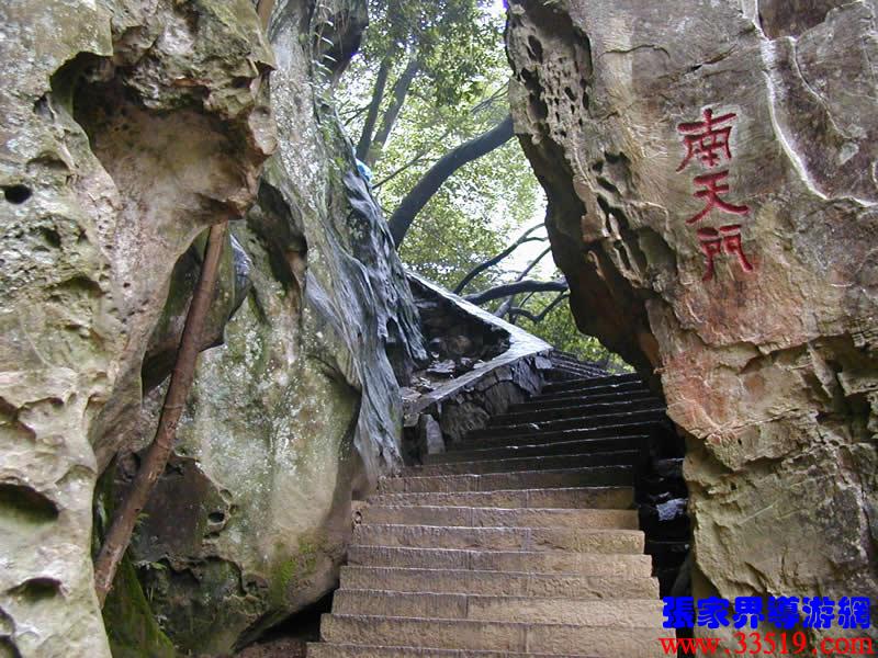 (南天門)(前行20米)現(xiàn)請(qǐng)大家抑頭望,可見一洞門,此門高約30米、寬4米左右,由游道兩側(cè)的兩座石峰斜傾拱峙而成。門右邊不遠(yuǎn)處一峰高約20米,峰頂如人頭,有臉有面,似把門將軍。