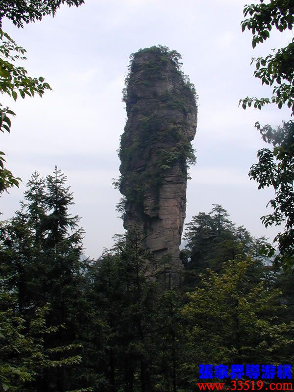 (南天一柱)現(xiàn)在我們前方幽谷峰林中有一高達(dá)200多米的孤峰,宛如擎天玉柱。上部灌木點(diǎn)綴,中部巖身赤裸,下部樹木遮掩,峰體渾圓、偉岸,因立南天門下而得名?!?/p>