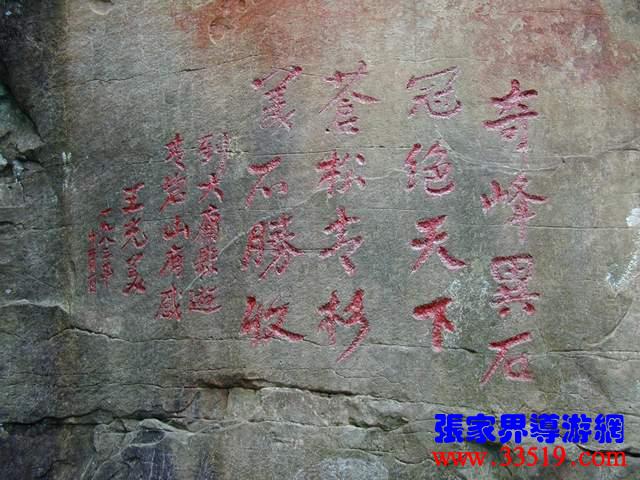 (王光美詩(shī)刻)1983年11月30日,前國(guó)家主席劉少奇夫人王光美在省人大副主任羅秋月等人陪同下,登上了張家界,她是最早訪問(wèn)張家界的上層名流。想當(dāng)年,這里還是一條人工剛剛挖出來(lái)的小毛路,王光美被一路風(fēng)光所震撼,也不免勾起了許多關(guān)于劉少奇的往事。這四句詩(shī)并不是一氣呵成的,前后到了四處景點(diǎn),才吟出這四句詩(shī)來(lái):奇峰異石,冠絕天下,蒼松青杉,美不勝收。