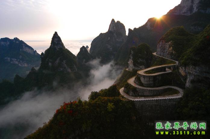 通天大道與天門山索道、天門洞開、空中花園并稱天門山四大奇觀,它共有九十九道灣,在索道上俯看如巨龍騰起,如玉帶盤纏,直通天際,使人為之震撼,堪稱天下第一公路奇觀。由此可直抵天門洞下天梯前。