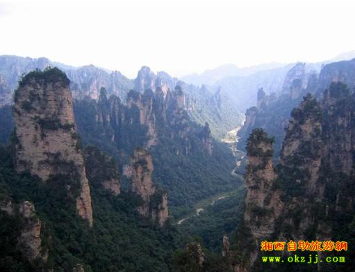 早上9點(diǎn)在路邊等旅游車(山上的車費(fèi)包括在門票中),路邊已經(jīng)站著很多住山上的自助游的游人,我們等了15分鐘才上車,大約20分鐘后在神堂灣下車,一個(gè)極具神秘色彩的地方,相傳明朝初土家族的一個(gè)古代首領(lǐng)向王天子兵敗受困于神堂灣,終支持不住整支軍隊(duì)跳崖自殺,每當(dāng)陰雨天或者天氣突變的時(shí)候,就能隱約聽到崖底人喊馬嘶的聲音……離神堂灣不遠(yuǎn)的地方是點(diǎn)將臺(tái),下面的四十八將軍巖栩栩如生,就像一個(gè)個(gè)整裝待發(fā)的將兵。接著我們走到賀龍公園,旅行團(tuán)去的地方,可想而知,到處是人,韓國(guó)人居多,這兩天見到的韓國(guó)人比中國(guó)人多,景區(qū)的韓國(guó)文字到處可見,連小販都能用韓語招攬生意,可見張家界在韓國(guó)的宣傳力度之強(qiáng)。這的景色一般,撥開人群,看看仙女散花和御筆峰,走人。中飯就在不遠(yuǎn)處的小餐館里解決。 飯后快12點(diǎn)了,向?qū)覀內(nèi)サ氖?a class="insidelink" href="http://www.lkqczs.cn/scenic/zjjjq/1529295057.html" title="天子山">天子山的精華景點(diǎn)大觀臺(tái),入口在公路旁邊,沒任何標(biāo)志,如果沒有向?qū)?,很難發(fā)現(xiàn)這里進(jìn)去是個(gè)絕佳的景點(diǎn)。去那的人極少,可以很清凈地觀賞美景。坐了一會(huì)的旅游車,就到了大觀臺(tái)的路口,我們沿著路走進(jìn)去,看到大觀臺(tái)的牌子,有三個(gè)年輕人在路邊休息,我們開始下石梯,剛好有對(duì)中年夫妻已經(jīng)上來了,他們都是早上下去游玩的,看他們氣喘吁吁的樣子就知道下面的行程有多累。之后我們六人再也沒遇上任何游人。走了無數(shù)階梯和平板路,看見上鎖的廁所、關(guān)閉的商鋪和地上無人清理的樹枝就知道這里真是很少有人來。 我們先到仙人橋,一座比天下第一橋更加險(xiǎn)峻的窄石橋,石橋前圍著鐵絲提醒游人這里危險(xiǎn)!長(zhǎng)10多米,寬不過1米的天然石橋,下面是350米深的山谷,兩旁四面皆無護(hù)欄,走在上面如果一不小心就會(huì)做自由落體運(yùn)動(dòng)。接著是天子座,四周有圍欄,左右兩邊都是空曠的山谷,這里的景色也很美。第三個(gè)景點(diǎn)是一步難行,兩座山之間,是一米多的距離,下面是深淵,如果一步不夠大,就摔下去了,據(jù)說從前曾經(jīng)有幾個(gè)人從這里掉下去,之后再?zèng)]人敢過去,后來修了鐵橋,不過走在鐵橋上,我還是感覺腳下涼颼颼的有些害怕。最后一個(gè)景點(diǎn)是神雞啄食,這里可以遠(yuǎn)眺干枯的十里畫廊。 回程的路上,兩旁樹叢中不斷有細(xì)細(xì)簌簌的聲音,估計(jì)是小鳥、松鼠之類的小動(dòng)物,走著走著又聽見聲音,回頭看看,輕輕對(duì)我說:“蛇” 我回頭撇了一眼,看不是很清楚,象蛇的形狀,“啊”的一聲我們倆迅速?zèng)_向前面,以前還不知道自己原來可以跑得這么快,還好蛇沒跟上來,呵呵,之后向?qū)Ь秃臀覀兞钠痍P(guān)于山中蛇的話題。回去頂著烈日不斷地爬階梯,好累!雖然累,對(duì)這兩天走的景點(diǎn)非常滿意,沒有讓我們失望。到路邊等車時(shí)已經(jīng)下午3點(diǎn)了,我們?cè)诖笥^臺(tái)走了三個(gè)小時(shí),也暴曬了三個(gè)小時(shí),回到住處時(shí)發(fā)現(xiàn)臉上都曬得脫皮了,嗚嗚!今天太累了,回去就倒頭大睡起來。