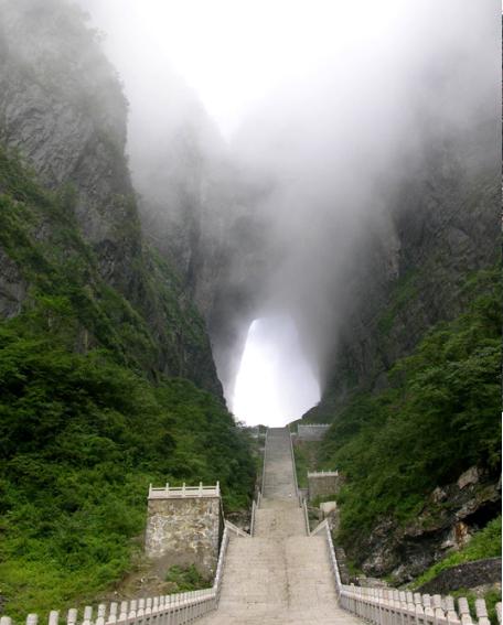 天門山上有一個(gè)天門洞,2006年03月,曾有俄羅斯之戰(zhàn)斗機(jī)在此表演飛躍天門洞的表演,還造成滿大的轟動(dòng)。上天門洞之前,必須先征服999個(gè)階梯,經(jīng)過(guò)一番努力終于登上天門洞之后,突有豁然的感覺(jué),人在山上,卻仍然在洞中,從這里更可以鳥瞰整個(gè)張家界市的景色。用完晚餐后,即乘車從張家界回車長(zhǎng)沙。